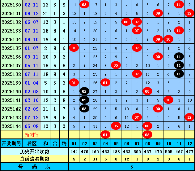 前区一号球上期开出2路奖号02,最近10期前区一号球出现限制在01-09区段,其中012路号码分别开出2个、5个和3,本期前区一号球防2路号码再出,参考号码05。